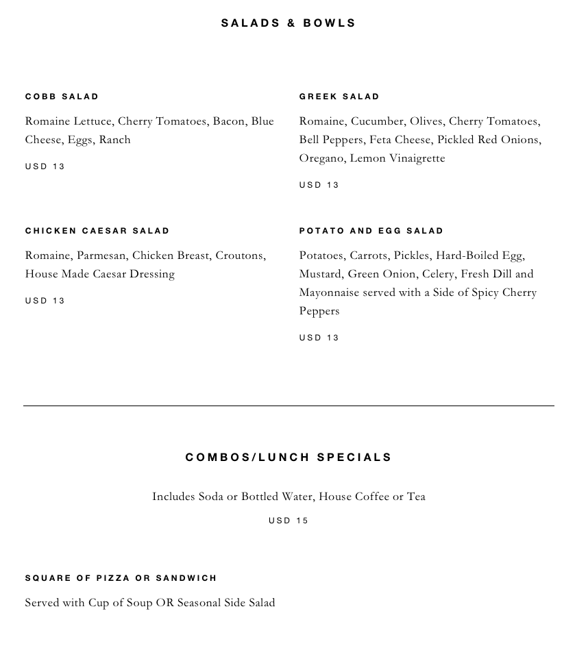 Salads & Bowls: The menu offers several salad options including Cobb Salad, Greek Salad, Chicken Caesar Salad, and Potato and Egg Salad. These items provide light meal choices that can be enjoyed for lunch or a wholesome snack.